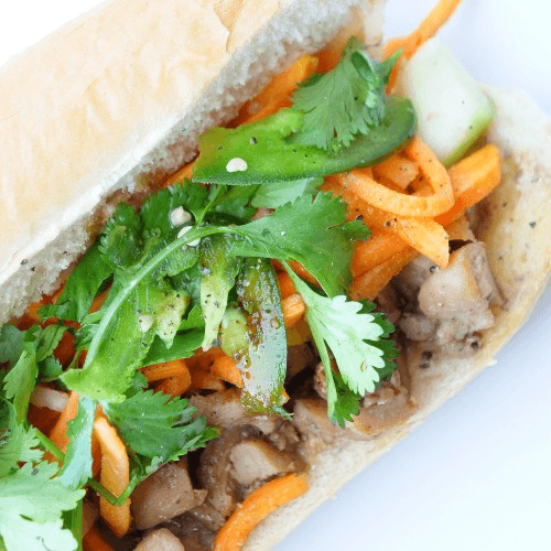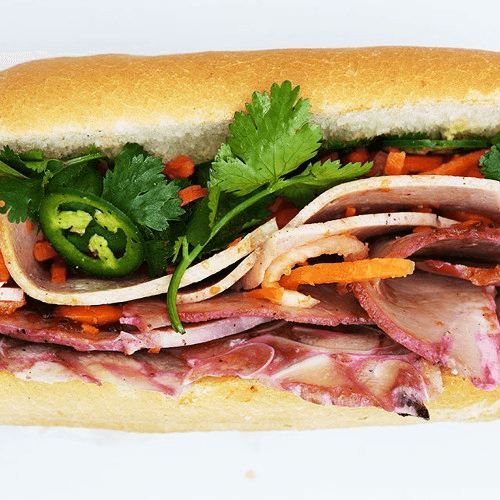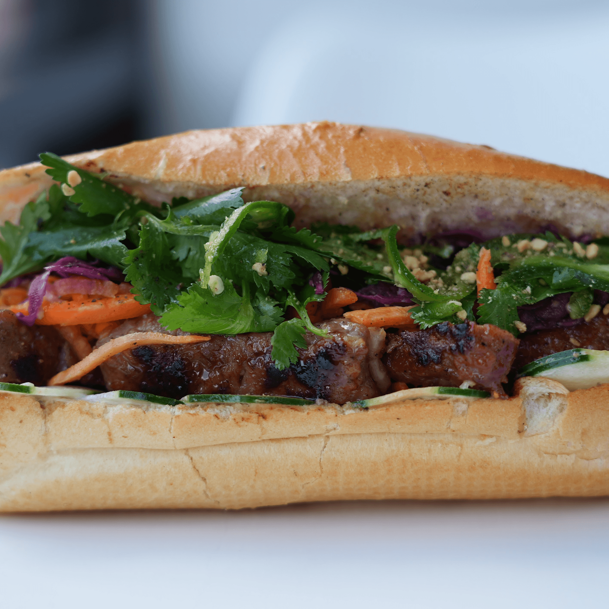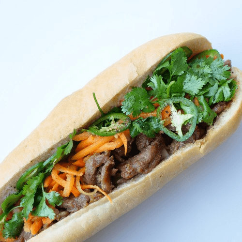 Lemongrass grilled beef with pickled julienne daikon & carrots, cucumbers, cilantro, jalapenos and house-made mayo & pate