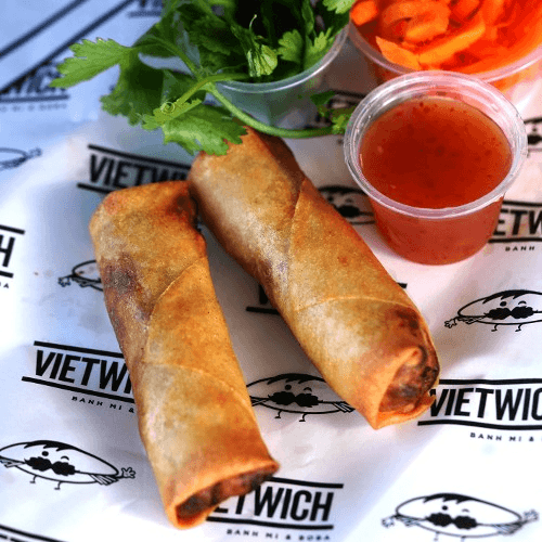 VIETWICH Vegetarian Vermicelli bowl with fried tofu topped with crush peanuts and our famous Enoki tofu sauce. Veggies include pickled carrots, sliced cucumbers, pickled cabbage, cilantro, and jalapeno and a side of one veggie egg roll.