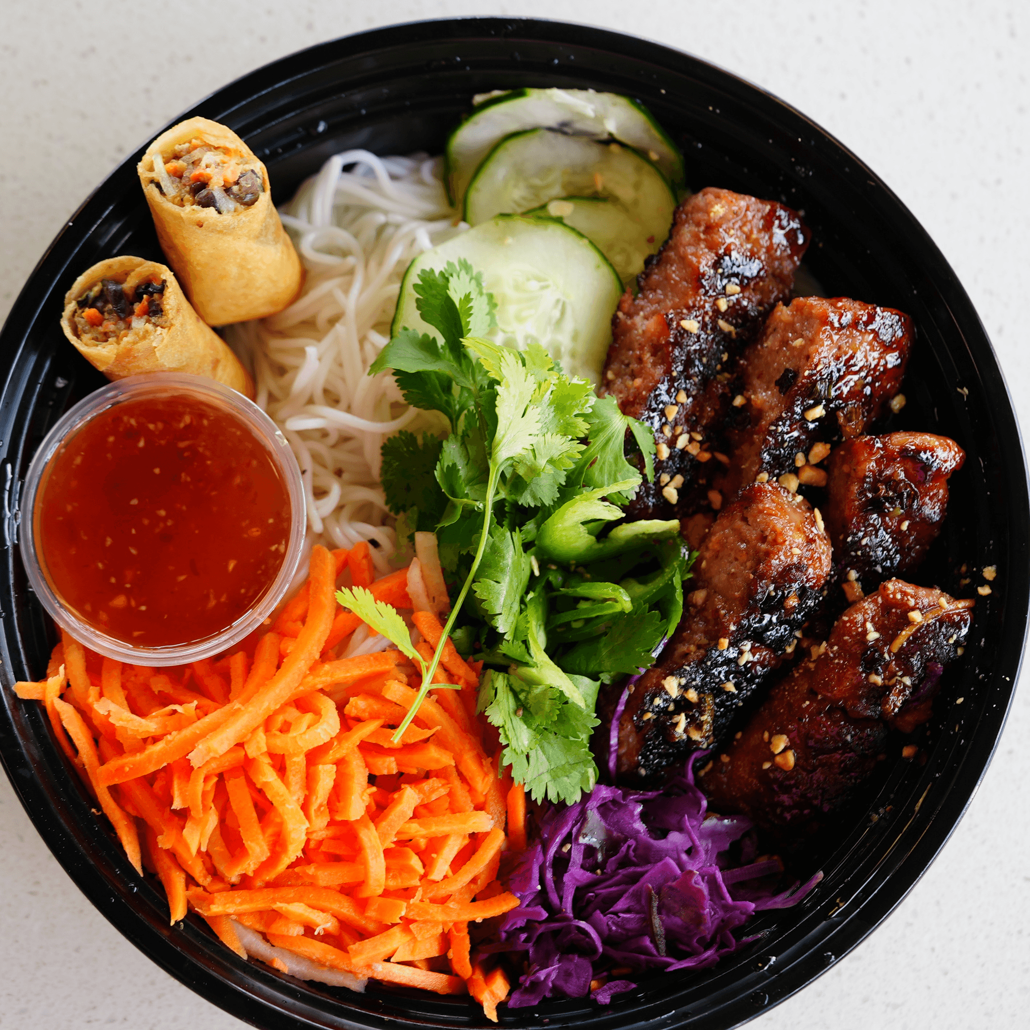 Hanoi honey glazed bun cha pork patties with vermicelli noodles, carrots, cucumbers, pickled red cabbage, cilantro, and jalapenos. Serves with 1 pork egg roll and fish sauce vinaigrette.
