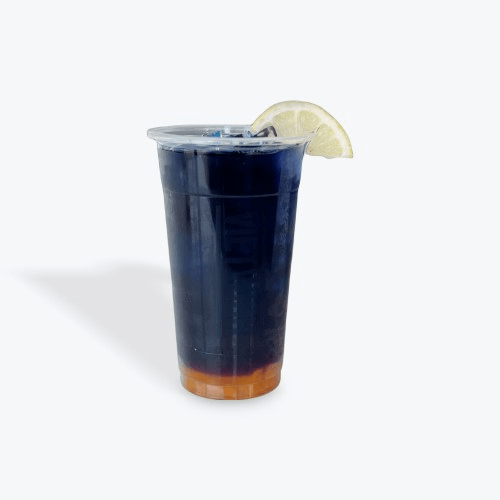 Galaxy-inspired, lemonade slushy with clear crystal boba, butterfly pea tea and edible glitter.