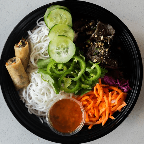 VIETWICH Beef Vermicelli bowl with grilled beef topped with crush peanuts and scallion oil. Veggies include pickled carrots, sliced cucumbers, pickled cabbage, cilantro, and jalapeno and a side of one mom's pork egg roll and fish sauce vinaigrette.